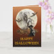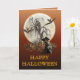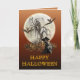 Une grande lune pâle avec un arbre déplaisant, deux chauves-souris qui volent, et une mignonne sorcière animée tenant un chat. Carte de voeux Halloween unique et entièrement personnalisable !