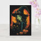 Carte d'Halloween Witchy - une belle sorcière à peau verte, portant son casquette noir avec un arc girly sur le devant. Elle est accompagnée de son fidèle familier - son chat noir qui vous regarde avec des yeux oranges captivants. Les citrouilles ont été taillés ; les yeux triangulaires, grinçant, sans dents et froids. Placez-vous sur un arrière - plan noir avec des cadres de couleur orange. A l'intérieur est le message - Avoir une Halloween éffrayante.