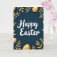 Designed with a deep teal-blue background that fades softly through a gentle gradient, this card sets a cozy springtime scene 🌷. Centered on the front, the words “Happy Easter” appear in large white lettering with smooth curves and a faint shadow that helps them stand out. The message sits right in the middle, inviting the eye the way a warm note between close friends might, calm and reassuring. Around the edges, a symmetrical frame of golden leafy stems curls inward, like two sides leaning toward each other in a quiet, affectionate gesture. Tucked among the foliage are several golden egg shapes, each decorated with thin white line patterns that feel like careful little details shared between loved ones 🐰. The gold elements shift from lighter to deeper tones, giving them a metallic look against the dark background. The border forms a balanced wreath effect, with the brightest gold highlights catching along the leaf tips and the patterned eggs near the corners.