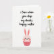 Designed with a bright white background, this card keeps the layout simple while drawing your eye straight to the message and the cute character below. Across the upper area, black cursive-style lettering reads, “i love when you clap my cheeks happy easter,” with the words stretching wide and leaving generous space around them. Under the text sits a small bunny-like figure in soft pink and coral, giving off a flirty, teasing tone 🐰. Its round head has shiny black eyes and two rosy cheek circles that make it look like it’s blushing at someone just out of frame. Two tall ears rise upward with gentle shading, adding height and a light springtime feel 🌷. The body shifts into a candy-wrapper shape in brighter pink, dotted with evenly spaced circles that add texture without crowding the design. The lower wrapper edge forms a scalloped line, like folded paper gathered at the bottom.