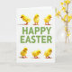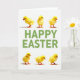 This card features six newly hatched little birds with sunny yellow fluff on a bright white background, arranged as three at the top and three at the bottom. Each tiny bird has an orange beak and small orange feet, and their slightly different poses create a friendly, close-knit feel, like companions leaning toward one another. Soft, diffused lighting makes their down look airy and gentle, with faint shadows that keep the scene grounded. Across the center, large green uppercase text reads “HAPPY EASTER,” forming a strong horizontal band that separates the two rows. The letters sit right in the middle and stretch across the card, balancing the birds above and below. The crisp white space around everything keeps the yellow and green colors looking fresh, and a small touch like 🌷 or 🐣 would fit right in with the spring look. The top row faces inward toward the center line, while the bottom row mirrors it, framing the green words between them.