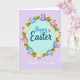 This card features a calm lavender background with a neat circular wreath that feels like a gentle embrace 🌷. In the center, a light blue circle holds the words “Happy Easter” in flowing purple lettering, with a tiny red heart tucked beside the phrase to add a sweet, affectionate touch. Around it, green leaves and small yellow and purple flowers form a ring, like a spring garland arranged for two people who care about each other. Tucked into the greenery are pastel egg shapes with marbled patterns in soft blue, pink, purple, and pale yellow, giving the design a tender, shared-celebration look 🐰. The eggs have subtle highlights that make them look slightly glossy against the matte background. Beneath the wreath, the text “Daughter & Son in Law” appears centered in small white flowing lettering. The final detail is the thin leafy stems and tiny blossoms evenly spaced around the circle, with the pastel eggs nestled between them.