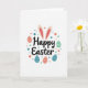 This card features the words “Happy Easter” in deep black lettering centered on a bright white background, with the message sitting like a friendly note at the heart of the design. Just above the text, two soft beige bunny ears with warm reddish-orange inner details peek in, as if a shy friend is leaning over your shoulder 🐰. Around the greeting, decorated eggs form a loose ring that feels like a gentle hug circling the words. The eggs are colored in calm teal, coral, and mint green, and they carry simple patterns such as horizontal stripes and neat rows of dots that suggest careful attention and a sweet, affectionate mood. Small dots in matching shades are scattered between the eggs, adding a light, floating texture that keeps the scene lively without looking busy 🌷. The text stays clearly readable in the center, while the surrounding shapes guide your eyes back toward it again and again. A few of the dots are slightly larger than the rest, sprinkled unevenly around the eggs near the edges of the layout.