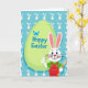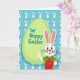 Designed with a springtime look, the card centers on a large pale green egg shape that fills most of the front like a soft backdrop. Across the egg, a bright blue greeting sits prominently, with a small blue butterfly nearby as a gentle accent 🌷. In the lower right, a friendly white bunny peeks out from behind the egg, its tall ears lined in pink and its round blue eyes giving a tender, welcoming gaze 🐰. The bunny wears red overalls over a green shirt, adding a cozy, companionable feel, as if it’s happily showing up to celebrate with someone special. One paw is raised in a thumbs-up, while the other holds a paintbrush with natural bristles and an orange handle, hinting that the egg has just been decorated with care. The background is sky blue and covered in a repeating pattern of small white bunny-head shapes, each with a simple smiling face. The blue greeting text is placed across the center of the green egg, and the butterfly sits close to the lettering on the egg’s surface. Behind everything, the sky-blue field is packed with evenly spaced, tiny white bunny faces in neat rows.