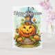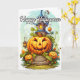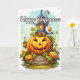 Cette carte de voeux unique illustre une maison hantée gardée par un citrouille. N'hésitez pas à ajuster toutes les options disponibles comme vous le souhaitez.