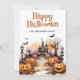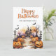 Joyeuse carte Halloween avec des illustrations aquarelles d'un manoir hanté, chauves-souris, jack o’lanterns et fantômes. Personnalisez facilement cette carte d'Halloween éffrayante avec votre nom de famille et votre texte.