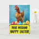 Designed with a springtime scene, the card features a detailed russet-brown hen near the top, its scarlet comb and alert gaze giving the moment a caring, watchful feel. Below her, a clustered row of decorated eggs creates a festive base, with glossy shells in crimson, lemon, emerald, and cerulean. The eggs are covered in simple squiggles, dots, and abstract markings that suggest someone took time to decorate them for a loved one 🐰. Behind everything is a softly blended sky-blue background that keeps the focus on the hen and eggs. A bright yellow rectangular banner sits across the lower middle area, outlined with a thin black border. Centered on the banner, dark lettering reads “DEAR HUSBAND HAPPY EASTER!”, standing out clearly against the yellow. The hen hovers above the colorful eggs while the yellow banner stretches across the scene like a sunny signpost 🌷.