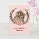 Chouette mignonne avec de longs cils dans une couronne de fleurs et une rose rose. Le fond est rose avec des points. À l'intérieur se trouve un vœu d'anniversaire que vous pouvez modifier et personnaliser