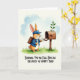This card shows a friendly, human-like rabbit delivering mail, dressed in a blue jacket over a white shirt with a matching blue cap, its soft orange fur and gentle smile aimed toward the open mailbox as if sharing a sweet note with someone special 🐰. One paw slides a small white letter into the slot while the other steadies the mailbox door, giving the moment a caring, between-friends kind of tenderness. A sturdy brown satchel sits on its back, adding to the tidy, on-duty look. The scene is set on fresh green grass under a pale blue sky with light clouds, keeping the background calm and airy 🌷. A tiny green sprout grows from the top of the rustic brown mailbox, hinting at springtime arriving. Centered beneath the illustration, the message “SENDING YOU AN EGG-SPECIAL DELIVERY OF HOPPY MAIL!” appears in thick, decorative lettering in a dark tone that stands out against the light space. The mailbox is a warm brown with an open lid, and the little sprout is a bright green tuft at the very top.