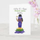 Mardi Gras Gal tenant un masque masqué sur sa main gauche. Femme à peau foncée portant une robe violette avec des tomettes violettes, vertes et jaunes. Elle a aussi des plumes violettes sur le col de sa robe. Mignonne Mardi Gras mode illustration joyeux d'anniversaire. Il fera un grand cadeau à votre ami, collègue ou fille. Un cadeau parfait à offrir pendant le carnaval et les dates de défilé.