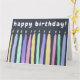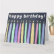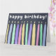 Ce design coloré et mignon présente une douzaine de bougies éclairées dans un style aquarelle, avec une variété de bougies fines et croustillantes, et une variété de couleurs (jaune, bleu, vert, violet, rose) sur un arrière - plan ardoise bleu ardoise foncé. Le texte personnalisable est placé au-dessus des bougies (message par défaut : "anniversaire heureux !")