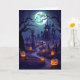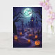 C'est une illustration sur le thème de l'Halloween qui représente un cimetière éffrayant et sinistre la nuit. La scène est éclairée par une pleine lune brillante qui projette une lumière éthérée sur le décor. Les chauves-souris volent à travers la lune, ajoutant à l'atmosphère d'Halloween. Le cimetière est rempli de pierres tombales et de croix, avec un sentier tortueux menant à un mausolée hanté ou chapelle dans l'arrière - plan. L'endroit est orné de nombreuses lanternes jack-o-lanternes aux visages brillants et sculptés, offrant un contraste chaleureux avec les tons cool et sombres du cimetière. Les arbres tordus et stériles contribuent à l'ambiance déplaisante et hantée de l'illustration. L'ensemble est une scène d'Halloween classique et atmosphérique, à la fois éffrayante et enchanteresse.