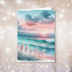 Carte d'anniversaire qui peut être personnalisée. Jolie scène de plage bleu pastel et rose. Des vagues océaniques sur le rivage sablonneux avec de délicates mauvaises herbes océaniques soufflant dans la brise par un jour nuageux au coucher du soleil.