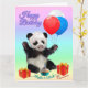 Pour une image adorable qui reçoit un sourire, ce mignon bébé Panda va un mile supplémentaire en tenant des ballons avec un joyeux signe d'anniversaire au-dessus et une bougie dans un cupcake en dessous avec amour. Fais un voeu !