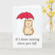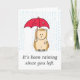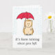 Un hérisson mignon mais pitoyable est trempé debout sous la pluie intense car il a un parapluie rouge déchiré. Le message sur la couverture dit : "Il pleut depuis que vous êtes partis." Le texte à l'intérieur dit : "Vous me manquez." Que le spécial sache à quel point il vous manque.