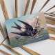 Un mignon oiseau vintage noir rouge et blanc avale portant de belles fleurs bleues blanches et roses sur l'océan et ciel bleu et blanc. L'idée cadeau parfait pour les amoureux des oiseaux ou les amoureux des animaux en toute occasion.