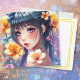 Pensez à votre carte. Belle fille aux yeux pourpres et aux cheveux foncés entourée de jonquilles jaunes. Plutôt floral et animé sur le thème de l'art numérique ai.