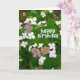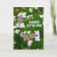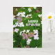 A birthday card design with a photo of the less common types of Hydrangea, Hydrangea Aspera which has these wonderful almost cartoon like flowers Happy birthday is writes in a child of cartoon style font subtly shaded to match the colors of the flowers.