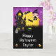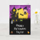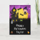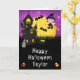 Cette carte d'Halloween amusante et éffrayante peut être personnalisée avec un nom ou un titre, comme fille, petite-fille, nièce, ami etc. Il présente une mignonne sorcière à côté d'une maison hantée et tordue. Dans l'arrière - plan est une pleine lune avec des chauves-souris et un ciel de nuit violet avec des étoiles. Le texte combine les polices décoratives et serif pour un look élégant et moderne. C'est parfait pour Halloween.