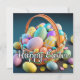 Cette carte de vœux de Pâques unique présente un panier coloré débordant d'œufs et de friandises. N'hésitez pas à ajuster le texte pour rendre cette carte personnelle et unique.