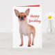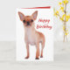 Élégez la journée spéciale de quelqu'un avec cette amusante carte d'anniversaire Chihuahua chippy. La carte présente un beau chihuahua tan et blanc avec un salut d'anniversaire joyeux imprimé en caractères rouges gras et mis en évidence contre un arrière - plan blanc immaculé.