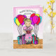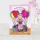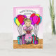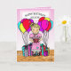 Main Drawn petite fille blonde tenant des ballons entourée de cadeaux fantaisie carte d'anniversaire enfant coloré.