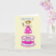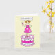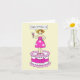 Une dame de bande dessinée debout sur un gâteau tenant un cocktail. La dame dit 'Joyeux Liz d'anniversaire'. L'image a un arrière - plan de couleur citron.