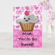 Maman, tu es si gentil ! Ce mignon dessert de cupcake kawaii délicieux est gelé avec de la glace et prêt pour le plaisir et les voeux de la mère jour. Joyeux cupcake visage avec coeur rose arrière - plan motif et cerise sur le dessus.