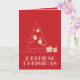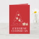 Les mots Merriest Christmas en lettrage vintage rétro, un croquis d'un arbre avec de faux ornements en feuille d'or et des cadeaux sont présentés sur une carte de voeux de Noël pliée en rouge. CORRESPONDRE des articles dans notre magasin.