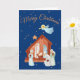 La carte de vœux Joyeux Noël de la Nativité présente une nativité simple et douce sur le devant de la carte, sur un fond bleu étoilé avec un ange. À l'intérieur de la carte, le côté gauche est bleu avec quelques étoiles dans les coins ; le côté droit est blanc avec des étoiles et le texte « Tous mes vœux de Noël ».