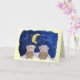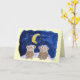 Les singes mignons de bande dessinée se reposent sous une lune de banane avec une nuit étoilée des étoiles de scintillement dans un moment spécial célébrant ensemble leur anniversaire. L'intérieur drôle d'énonciation lit : "Bananaversary heureux !" et alors également "je suis si heureux nous nous sommes réunis"