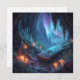 Un livre ancien repose sur la pierre à l'intérieur d'une grotte lumineuse, entouré de lanternes, de cristaux et de champignons lumineux.
