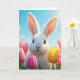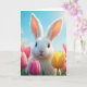 Un lapin blanc et moelleux aux oreilles larges est entouré de tulipes colorées, se prélassant sous un ciel lumineux et ensoleillé. Le texte peut être modifié.
