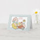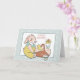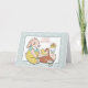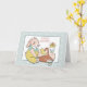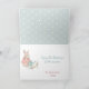 Sur le devant de cette jolie carte de Pâques se trouve un lapin de Pâques à l'ancienne habillé de vert sarcelle et de jaune, et assis à côté d'un panier. À l'intérieur du panier se trouve un petit poussin jaune. Le texte ci-dessus dit "Joyeuses Pâques" en rose doux. Un cadre à motif entoure l'image et le texte. À l'intérieur, il y a plus de champs de texte personnalisables en rose et vert sarcelle pastel. Il y a une autre image du lapin avec un arrosoir en bas.