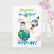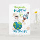 Une carte de design amusante pour un 5ème anniversaire avec un astronaute assis sur le monde avec une fusée spatiale à proximité et un arrière - plan de planètes et d'étoiles filantes. Un design amusant pour ces petits garçons qui auront cinq ans. Peut être personnalisé en modifiant le nom et l'âge puis ajouter votre propre message à l'intérieur . Une belle carte d'anniversaire pour un petit-fils ou un neveu.