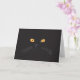 Chat noir avec les yeux rougeoyants oranges. Le favori inférieur se courbe dans le mot, "huez !" À l'intérieur de lit, "Halloween heureux !"