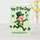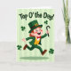 This greeting card features a lively leprechaun striding forward as if hurrying to meet a friend, his grin wide and his eyes crinkled with laughter. He wears an emerald green suit with a bright yellow waistcoat, a red bow tie, and a tall green hat topped with a gold buckle, with a slender black walking stick held in his right hand. His cheeks are softly rosy, and the open, welcoming expression on his face feels like a friendly wink across the room 💚. The background is a pale green field with subtle vertical stripes, giving the scene a light, airy setting. Near the top, the phrase “Top O’ the Day!” sits prominently in dark green lettering, centered above the character. Four shamrocks float around the scene like little accents of luck, adding a festive touch ☘️. An oval shadow rests beneath his feet, grounding his mid-step pose against the striped green backdrop.