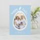 Personalizable photo template card designed for Easter by Destei. Your photo is placed inside an Easter egg shape with a white border and light blue dots. The top of the egg reads “Happy Easter,” separated by a cute bunny silhouette with space at the bottom for a name and year. The text appears in white on a light blue background and both colors can be changed if desired. On the back, a pattern of tiny Easter eggs creates a playful polka dot effect. A whimsical and festive design for sending Easter greetings.