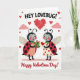 This Valentine’s Day greeting card features two adorable ladybugs sharing a heartfelt moment against a bright white background. The ladybug on the left has a red shell with black spots and holds a green gift box tied with a red ribbon. The ladybug on the right wears a cream dress decorated with tiny red hearts and carries a small envelope marked with a red heart. Both have cheerful smiles, rosy cheeks, and matching green bow ties. Above them, bold lettering reads “HEY LOVEBUG!” with “Happy Valentines Day!” written below in a flowing script. Small red hearts and soft pink clouds float nearby, giving the card a warm and loving feel that’s perfect for sharing Valentine’s Day wishes.