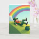 This St. Patrick's Day card shows a laughing leprechaun stretched out on a bright green hillside, relaxed as if he’s sharing a private joke with a close friend 💚. He wears an emerald suit with a tall hat and buckled shoes, and his rosy cheeks and wide grin make him feel easy to root for. A warm orange beard stands out against all the greens, adding a lively contrast to his face. Across the top, a wide rainbow 🌈 arcs through a light blue sky, with a few soft clouds drifting in from the left. The slope is dotted with small shamrocks, and the gentle curve of the hill guides your eye down the scene. In the lower right, a dark green pot sits slightly tucked into the grass, like a quiet invitation to step closer and look. The greeting text appears near the top in green, set against the sky so it’s easy to read, while the rainbow bands stretch behind it.