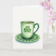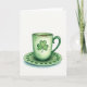 This card features a green teacup and saucer centered on a bright white background, with Irish details that feel like a shared little treat between close friends 💚. The cup has a soft, watercolor-like texture, and a three-leaf shamrock sits right on its front, shaded in several emerald tones that make it look gently rounded. Along the rim and the curved handle, a scalloped trim like tiny pearls adds a dainty touch, echoed again around the saucer’s edge. Inside the cup, dark brown tea creates a cozy contrast, as if it’s been poured for two to linger over. The saucer is decorated with a ring of small repeating shamrocks and a neat center pattern of concentric circles that hints at Celtic knotwork. There’s no text on the front, so the illustration stays uncluttered and easy to take in, with one small ☘️ detail carrying the whole message visually. Even, soft lighting keeps the greens smooth and layered, and the cup-and-saucer set sits squarely in the middle with plenty of white space all around.
