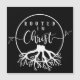 Enracinée dans le Christ, cette conception présente un design noir et blanc avec les racines d'un arbre et un texte disant "Enraciné dans le Christ".
