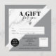 Motif moderne chic en marbre noir et blanc et bloc de couleur gris modifiable simple certificat cadeau carré, ajoutez votre logo, avec un coeur. Bon cadeau d'anniversaire ou de Noël idéal.