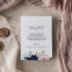 Ce mariage floral nautique moderne qui souhaite une bonne carte est parfait pour une croisière ou un mariage sur la plage. Le design fantaisiste présente des fleurs d'aquarelle rose pâle et bleu marine aux accents d'étoile d'or, donnant une ambiance de plage. Personnalisez cette carte d'invitation avec vos noms, et un court poème de bienvenue.