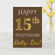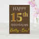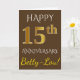 Cette carte de vœux simple et personnalisée pour un anniversaire de mariage présente le message "Joyeux 15ème anniversaire de mariage", avec le "15ème" ayant une apparence dorée factice. Le devant comporte également un nom personnalisé et un fond de couleur marron. L'intérieur contient un message de vœux personnalisable pour l'anniversaire de mariage. Elle peut être offerte à un mari ou une femme pour célébrer le quinzième anniversaire de mariage du couple.