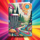 Je vous souhaite le meilleur anniversaire par par. Un parcours de golf à disque coloré unique dans un champ de champignons rétro, pins, nuage tourbillonnant coloré, soleil aux couleurs vintages comme le bleu, le vert, le rose et l'orange.
