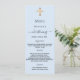 Baptême, carte de menu de réception à baptême. Personnalisez et ajoutez un nom, une date et le menu. Un arrière - plan bleu clair et une croix dorée.