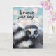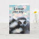 Merci mignon, carte de voeux en papier avec une photo d'un lémurien à queue cerclée enveloppé dans sa queue. Carte de voeux à thème faune. Lemur dit juste ... ou laissez-moi juste dire... un jeu de mots écrit sur la couverture. Customisez le message intérieur comme vous le souhaitez. Copyright © Shoaff Ballanger Studios, 2024.