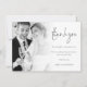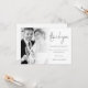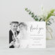 Merci minimaliste de Mariage de script de superposition de photo. Disponible numériquement et imprimé. Remplacez simplement l'exemple de photo par le vôtre par cet élégant Merci de mariage. Votre photo sera téléchargée en noir et blanc comme un filtre a été appliqué. Pour désactiver le filtre et avoir votre photo en couleur, cliquez sur le bouton Modifier dans l'outil de conception et sur le panneau de droite sélectionnez Filtrer, puis choisissez "Aucun". Le Merci est dans un style d'écriture et le reste du texte que vous pouvez facilement personnaliser. Une couche graduée d'opacité de teinte est au-dessus de votre photo afin que votre texte puisse être vu comme il est partiellement recouvert sur le dessus.