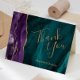 Cette élégante carte de remerciements mariage moderne dispose d'une bordure en aquarelle violette ornée d'une parties scintillant en faux or. Le texte personnalisable combine les mots "Merci" en écriture manuscrite couleur or et les noms de la mariée et du marié en caractères italiques sur un arrière - plan turquoise aquarelle agate.